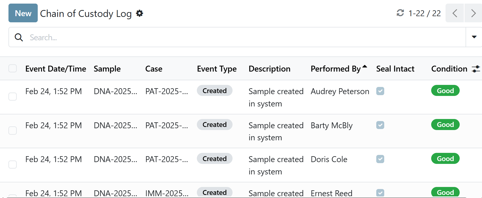 Yes. The system records every action on each sample or evidence item, including time, user, and status, to maintain a complete custody log.