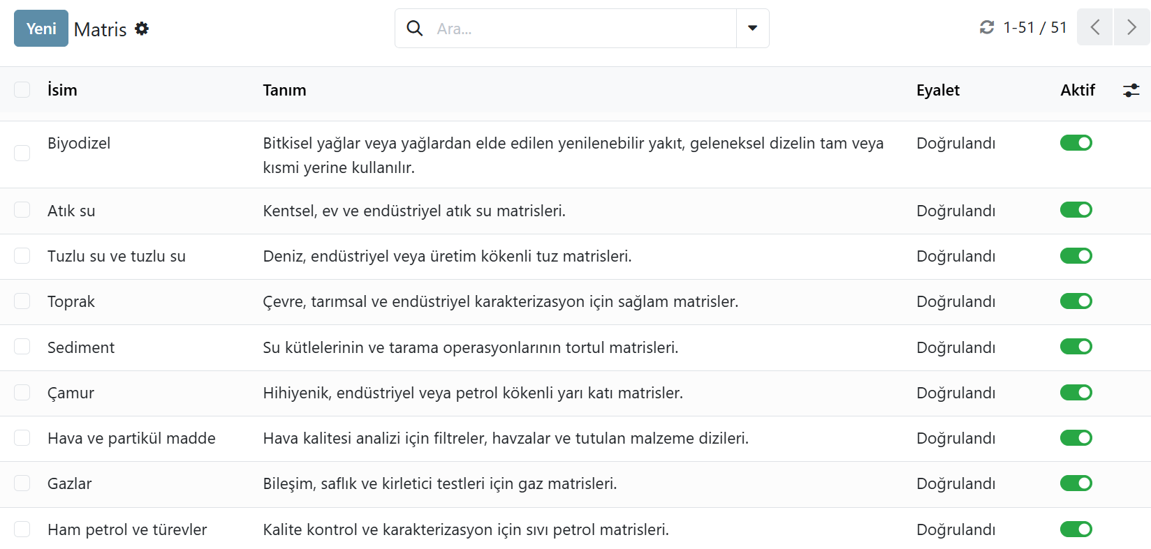 Çeşitli laboratuvar sektörleri için Odoo tabanlı LIMS'de yapılandırılmış matris örnekleri.